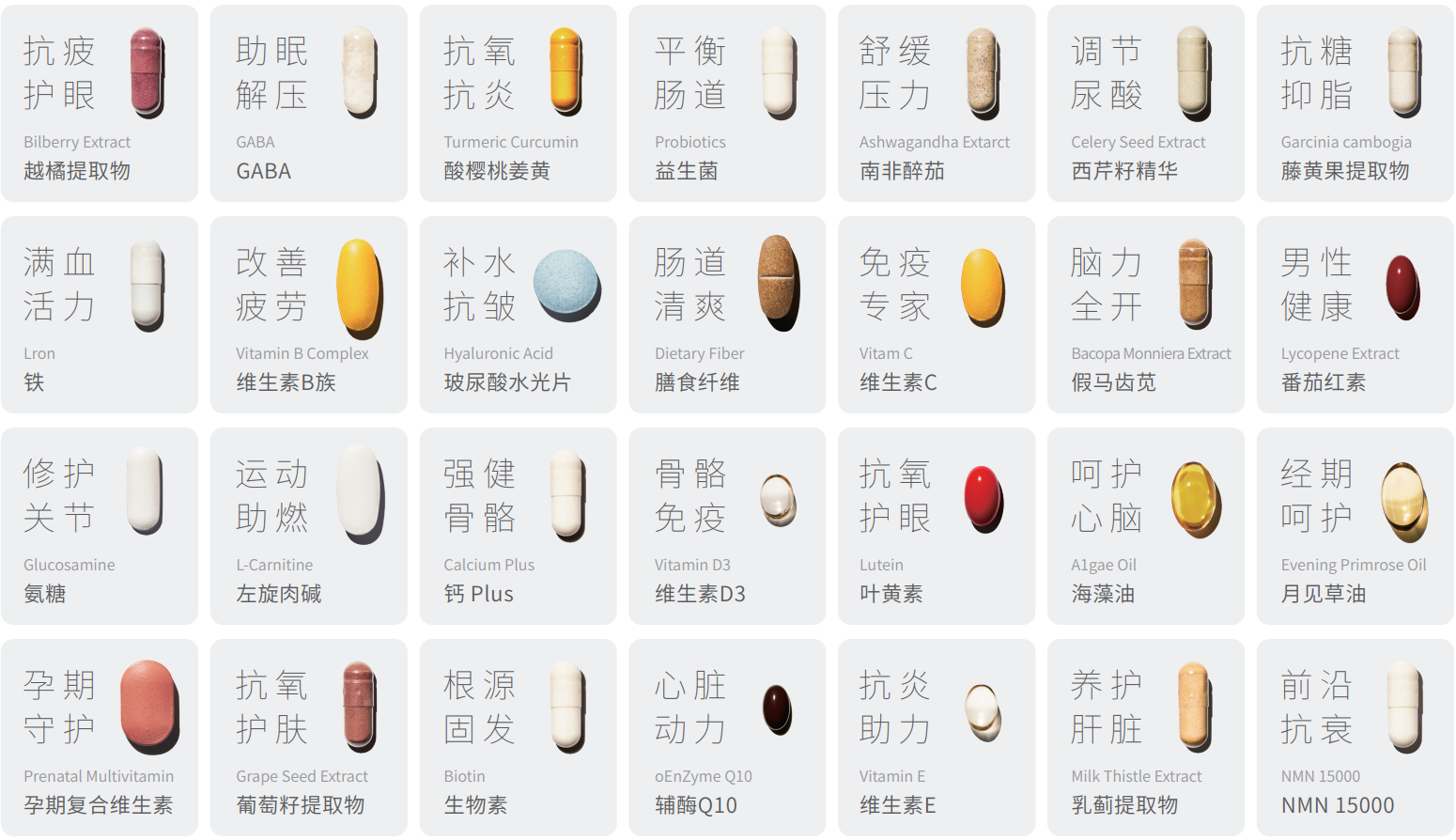 30+款营养补剂,面向16+项健康分类,满足个性化需求